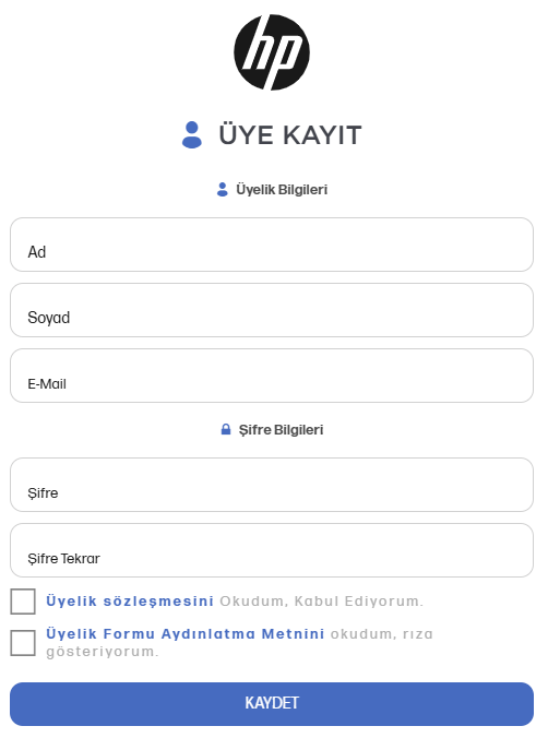 Üye Kayıt formunda yer alan alanları doldurup “Kişisel verilerin işlenmesine ilişkin aydınlatma metni ve “Üyelik Sözleşmesi”ni onaylayarak Kaydet butonuna tıklayarak üyeliğinizi gerçekleştirebilirsiniz.